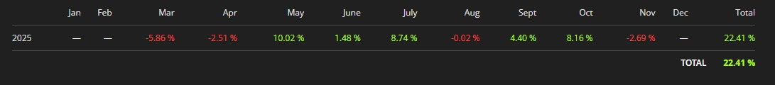 Return since inception March 5, 2025 to November 11, 2025 - in euro 22.41%, in US dollar 30.97%.